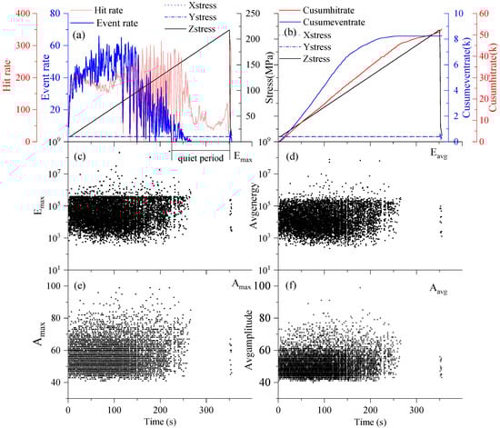 The change trends of different parameters, i.e., the absolute energy (Emax, Eavg) and amplitude (Amax, Aavg) values of AE events in specimen G10-10, are shown in Figure 3c–f. Emax, Eavg, Amax and Aavg are only meaningful for one AE event. Emax and Amax are the maximum value and selected among the AE sensors triggered by the same AE events, and Eavg and Aavg are the average value of the AE sensors triggered by the same AE events. In this study, Emax and Eavg have a similar change trend; Amax and Aavg also have a similar change trend. The total AE process can be divided into “active period” and “quiet period” according to the distribution of ER and the E and A values. As σ1 approached its peak value, and the values of HR and ER decreased to approximately 50 and less than 10, respectively (which was the quiet period). The HR curve was observed to fluctuate slightly, while the ER remained stable. Therefore, it is more scientific and reasonable to use ER to determine the quiet period.