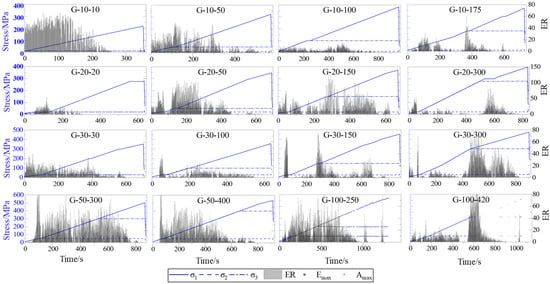 ER, stress vs. time of all specimens in this study. The specimen No. was designed as “G-digit1-digit2”, where “G” represents granite, “digit1” represents the applied stress value of σ3, and “digit2” represents the applied stress value of σ2; for example, “G-10-50” means that the applied stress value of σ3 and σ2 on this granite specimen are 10 MPa and 50 MPa, respectively.