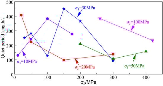 The length of the quiet period is shown in Table 1. When σ1 reached between 50% and 93% of its peak value, the ER and HR values significantly declined, and AE entered the quiet period. Figure 5 shows the length of the quiet period, and a large dispersion in the distribution of the quiet period can be observed; the duration was from 93–452 s, the mean was 239.79 s, and the variance was 114.81. The stress at the beginning of the quiescent period was 27–91% of the maximum stress (mean is 69%). Because there is no obvious rule between the length and start time of the quiet period under different stress states, it is difficult to predict rock failure.