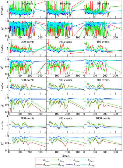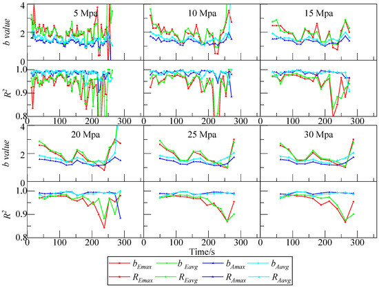 In order to distinguish the changes in the b value with time when true triaxial stress is loaded, the b value was estimated using the AE data during a certain stress proportion interval. Because the stress had a positive relationship with time, the loading speed was fixed at 0.3 KN/s. Figure 9 shows the result of the b value estimated according to the AE data during a certain stress interval. The stress intervals of σ1 were 5, 10, 15, 20, 25, and 30 MPa, and a threshold for a minimum number of AE events was set at 200. The trend of the b value is obvious: it first dropped and then increased, which is consistent with Figure 8. Table 4 lists the mean of R2 at different AE stress proportion intervals for the specimen G-10-10, and the mean of R2 for both RAmax and RAavg perform well, such that both values are greater than 0.95, and hence, difficult to choose. Combined with Figure 9, setting stress intervals at 20 MPa takes both data size and reliability into account.