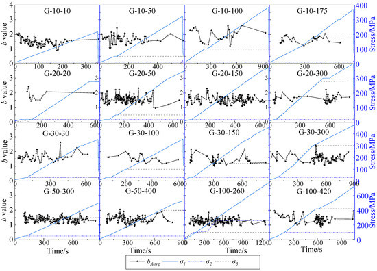 A comparison of the interval of the AE event count at 200, the stress proportion at 10% σ1, and stress magnitude at 20 MPa, showed that all their R2 values performed well; while the interval of stress proportion at 10% σ1 required the acquisition of the maximum value of σ1, the interval of stress magnitude at 20 MPa may be affected by the load speed, and the values of σ2 and σ3. Therefore, the AE event count at 200 is considered to be better for real-time monitoring of rock damage; hence, the AE event interval method is more reliable than the stress interval and the stress proportion interval methods. Therefore, the b value calculated using Aavg and setting the interval of the AE event count at 200 was chosen for plotting all b value curves for the granite specimens, as shown in Figure 9. The b value was observed to decrease first and then increase or oscillate, and finally decrease. Moreover, the b value exhibited a decreasing trend before fracture in approximately 80% of the specimens.