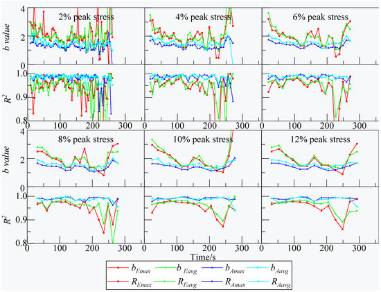 In order to distinguish the b value at each loading stage of the rock specimen, the AE events contained in different intervals of stress proportion were used to estimate the b value. Figure 8 shows the variation of b value at the chosen stress proportion intervals of 2%, 4%, 6%, 8%, 10% and 12% of the peak value of σ1 and a threshold at 200 for a minimum number of AE events in a stress proportion interval was set to ensure the accuracy of the b value. Figure 10 shows that there is a blank space on the right side of the b value curve, and the trend of the b value is obvious when the stress proportion interval was less than 10%—it first decreased and then increased, which is, however, not consistent with Figure 8. The portion of the b value curves falling in the final stage was missing, mainly because the AE event count intervals were less than 200 in the quiet period. The mean of the R2 at different AE stress proportion intervals of G-10-10 is listed in Table 3; the value of bE (bEmax and bEavg) was observed to be smaller than that of bA (bAmax and bAavg), and the mean R2 of bEmax increased as the stress proportion interval increased, while that of bEavg first increased and then slightly decreased. According to Table 3, calculating the b value using Amax and setting the stress proportion interval at 10%, σ1 is better for distinguishing the b value at each loading stage.
