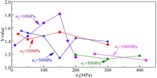 Figure 10 shows the b value for the whole process of five groups of granite specimens under different true triaxial stresses, calculated using the average amplitude of the AE event. Apparently, the b value ranged between 1 and 2, and generally decreased with increasing confining pressure, as observed in the aqua rectangle area shown in Figure 10. Furthermore, in the specimen group σ3 at 10 MPa, the b value was observed to decrease after an initial increase with increasing σ2. In the specimen group σ3 at 20, 30, 50, and 100 MPa, the b value tended to decrease with increasing σ2. In addition, when σ3 was 50 and 100 MPa, the b value was approximately 1.1, which is smaller than that of the other groups (~1.4); this means that a small b value may associate with high confining pressures. Since a large number of AE events with large amplitude will occur with the increase of differential stress, especially in the final loading stage in rock AE tests, this will in turn result in a decrease of b value. Therefore, temporal variation of the b value can be used for damage accumulation assessment in rock AE tests, while spatial variation of the b value can be used to determine the stress concentration area, and the temporal-spatial variation of the b value is an important reference for precursory analysis of rock instability.