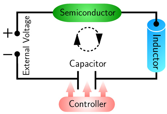 Acknowledging the limitations of PINNs and other NN-based controls, a question emerges: can control signals be incorporated in PINNs for chaotic nonlinear dynamical systems? To investigate this, we focus on a system proposed by Balthasar van der Pol in 1920 when he was an engineer working for the Philips Company (in the Netherlands) while studying oscillating circuits [38,39,40]. The van der Pol system exhibits highly chaotic behavior encompassing wide applications in biology, biochemistry, and microelectronics [41,42,43]. The traditional control of the van der Pol system usually includes linearizing the system and adding a forcing term based on the linearized system to impose control [44,45,46,47]. A basic setup of the oscillating van der Pol circuit is illustrated in Figure 1: an external voltage excites the circuit, inducing a current that can be converted to a charge through the capacitor [48]. If the semiconductor as indicated in green is equipped, the circuit will display highly nonlinear behavior that is hard to control and predict. Designing a controller (red block) for controlling the chaotic, nonlinear behavior in such circuits is our main goal.