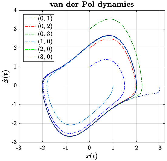 The van der Pol dynamics describe the oscillatory behavior of a class of nonlinear equations [38], originally describing the oscillating circuits with semiconductors introduced in Section 1, as expressed in Equation (1):