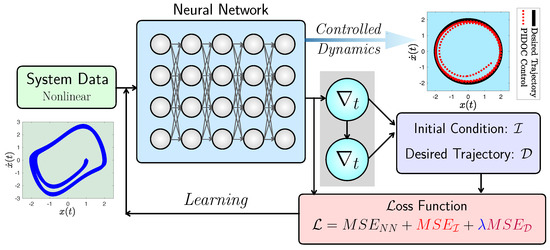 In recent decades, the skyrocketing usage of big data, assisted by advanced computing technologies such as GPU computing [20], has led to the enhancement of machine learning algorithms—specifically, deep neural networks [21]. Deep neural networks can learn and capture features from highly nonlinear data for accurate predictions, indicating their huge potential and attracting a great deal of attention in various fields. Encoding physics information in the losses of a deep neural network (NN) promises the faster, accurate learning of physics with neural networks by respecting the basic laws of physics using less labeled data, commonly recognized as Physics-Informed Neural Networks (PINNs) [22,23]. One of the most celebrated characteristics of PINNs is their ability to learn from sparse data [24]. Upon the proposed PINN framework, various PINNs designed for disparate engineering applications have emerged. Perhaps their most renowned use is in predicting fluid fields [25,26], but other notable uses include electronics applications [27,28]. Notably, there have been a few attempts to use the PINN-based method to learn and predict nonlinear dynamical systems and chaos [29,30,31,32], with a notable good attempt by Antonelo et al. [33] to modify PINN to adjust systematic controls based on the predictions of PINN. Furthermore, PINN has been used to learn controls for a series of optimal planar orbit transfer problems [34]. However, most applications focus on the “learning” and “discovery” of dynamics with PINNs, while few actually focus on “controlling” the system—that is, guiding the system to behave as human-desired signals. Attempts have been made to use NN for controls as far back as the 1990s [35,36,37], but these attempts were limited to replacing a block or parts of the closed-loop framework with an NN rather than directly using the NN-based framework for signal controls.