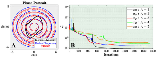 Three characteristics of PIDOC control can be concluded from Figure 4: (1) PIDOC successfully implemented the control to guide the system behavior based upon ; (2) The PIDOC-controlled dynamics exhibit a phase lag with the desired signals; (3) the acceleration exhibits a fluctuating behavior. For (2) and (3), the following explanations are provided: the phase difference in (2) (Figure 4B) is attributed to the PIDOC aiming to follow the given initial positions encoded in Equation (6). The stochasticity for (3) observed in Figure 4C can be attributed to both the stochastic nature of NN training and the numerical differential of position . The weights in Equation (4) are randomized and renewed throughout the iterations so as to approximate the nonlinear data given for training. While they seem smooth for the first-order approximation of in Figure 4B, the higher-order terms will enlarge the stochasticity of the signal. Moreover, in the formulation of PIDOC, as adopted from PINNs [22,23,54], automatic differentiation also elicits errors, such as those encoded in (Equation (6)) [60]. Both can also be counted as factors explaining the fluctuations in Figure 4C.