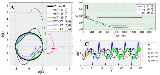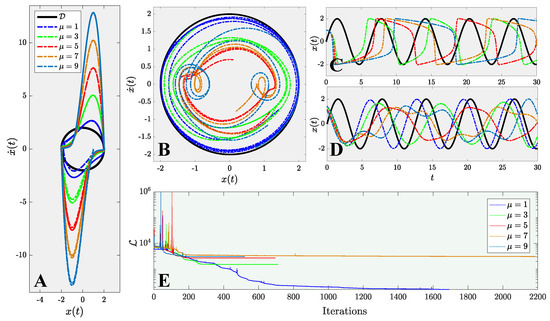 Nonlinearity is a key part of control, especially for chaotic systems such as those studied here. For van der Pol oscillating circuits, systematic nonlinearities are represented by different values, varying from , for testing PIDOC controls. Figure 7A depicts the phase portrait of such intrinsic nonlinear dynamics. After imposing the PIDOC controls, Figure 7B shows the output control with different values. Figure 7C corresponds to Figure 7A, showing how evolves over time with the van der Pol inherent dynamics. Figure 7D corresponds to Figure 7D, showing the time evolution of for PIDOC controls. Figure 7E shows the loss function–iteration diagrams of different PIDOC controls for systems with different nonlinearities.