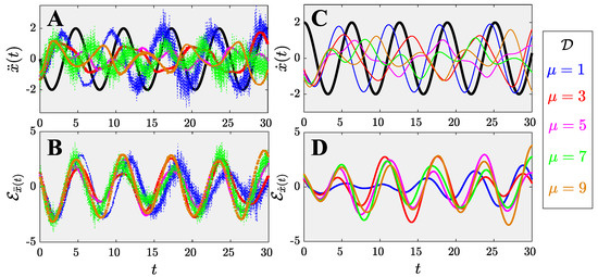 The plot of velocity and acceleration and their corresponding errors regarding time t and considering cases of different nonlinearities. Note that the colors used for cases in van der Pol systems of different nonlinearities are shown in the legend on the right side, where stands for the desired control trajectory. (A) The acceleration -t diagram. (B) The errors in the acceleration. (C) The acceleration -t diagram. (D) the errors in the velocity.