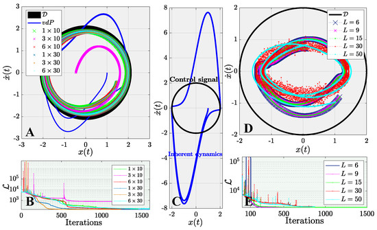 Figure 9A,B shows for reduced NN layers and neurons all exhibits good control implementations, with a slightly trajectory variation at the beginning stage for neural network structure as indicated in the pink line with higher losses. Figure 9C plot the intrinsic dynamics of van der Pol system with , as comparing with the controlled phase in Figure 9D: with increasing layers the controlled phase shows reduced nonlinearities, especially for layers and 50 for comparing the light and pure blue dashed lines—the vortex-liked shape on the two sides of the phase when evidently reduced with increasing layers. For different layers the losses show a similar trends as reported in Figure 9E. Notably, Figure 9A also indicate that single hidden layer neural network shows good approxibilities, with better phase control than neural network structure of .