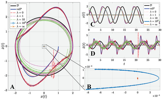 System behavior analysis of the effects of the Lagrange multiplier on the control signal implementation for PIDOC. Note that the black solid line is the desired trajectory, the blue solid line denotes the van der Pol inherent dynamics, and the controlled routes of different Lagrange multiplier values are denoted in differently colored dashed lines. Note that all the colors in the subfigures are marked the same as those represented in the legend in subfigure (A). (A) The phase portrait of the PIDOC controls. (B) Zoomed view of rescaled Lagrange multipliers and . (C) The position against time t for the desired trajectory , van der Pol inherent dynamics, and different PIDOC controls. (D) The acceleration against time t for the desired trajectory , van der Pol inherent dynamics, and different PIDOC controls.