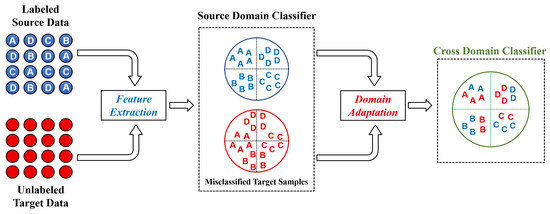 To address this issue, many deep learning-based approaches have been proposed to transfer the knowledge that is obtained from the source domain to the target domain while the target domain is collected under different operating conditions [8,9]. Hasan et al. [10] proposed a deep learning-based transfer learning approach to improve the feature extraction capability of bearing fault diagnosis systems. On the other hand, domain adaptation (DA) approaches are widely used to reduce the discrepancy between source and target domain data distributions [11,12,13,14]. As demonstrated in Figure 1, the distribution discrepancy between the source and target domains results in the ineffective performance of source domain classifier when applied in the target domain. Fundamentally, in most of DA approaches, the classifier built using source domain data is adapted for its use in the target domain by aligning the source and target domain distribution in a latent feature space.