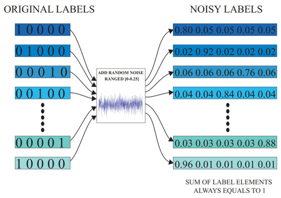 For instance, consider as the one-hot encoded health label of a sample, where denotes the number of classes in the problem. After injecting a random noise value , the noisy health label thus becomes , . In this manner, the noisy health label still maintains its compatibility with the softmax function such as the typical one-hot vector labels. For a better understanding of this concept, a schematic representation of this proposed technique is presented in Figure 2.