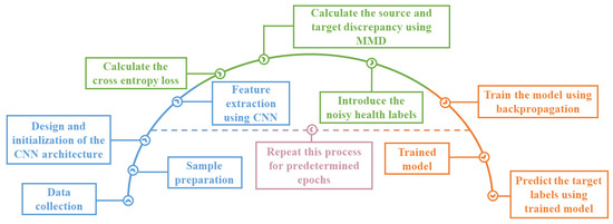 where and are the model parameters and learning rate, respectively. The flowchart of the proposed cross-domain fault diagnosis method is demonstrated in Figure 4.
