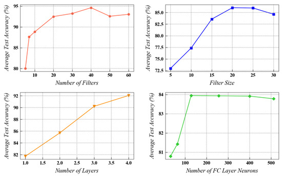 In this section, a sample task from the CWRU dataset is analyzed for finalizing the network architecture parameters used for performing the experiments. Four main hyperparameters, viz., the number of filters (), filter size (), number of convolutional layers and the number of neurons in the fully connected layer are mainly focused on, as they significantly affect the network optimization process in the fault diagnosis framework. These experimental tests for parameter finalization were performed using a 5-fold cross-validation approach. In the CWRU dataset, the transfer task from 0 hp to 3 hp, having the maximum domain discrepancy, is selected for running the tests in this section. The experimental results for the above-mentioned parameters are presented in Figure 5.