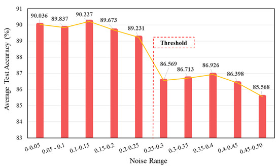 For a deeper assessment of the proposed noisy label methodology, multiple experiments were performed by changing the extent of induced noise in small increments (0.05 increase) and then monitoring its effect on the test accuracy. A sample transfer task of 3 HP to 0 HP from the CWRU dataset, with a higher noise (SNR = −2) in the target data, was focused on. Higher noise level in the target domain data ensured a better evaluation of the method’s robustness and noise level selection. The test results are presented in Figure 6. It is clearly indicated in the figure that the addition of a smaller noise level in the health labels results in a significant increase in the model’s diagnostic performance. However, it should be noted that the introduction of a larger noise level above a certain threshold will reduce the testing accuracy of the model. For instance, when a higher noise level above 0.25 is injected into the health labels, a significant drop of almost 3% is observed in the testing accuracy. According to these experiments, an optimum level of noise, , was chosen, and a random noise value in the interval of [0, 0.25] was created for every epoch to obtain the needed noisy health labels for the experiments.