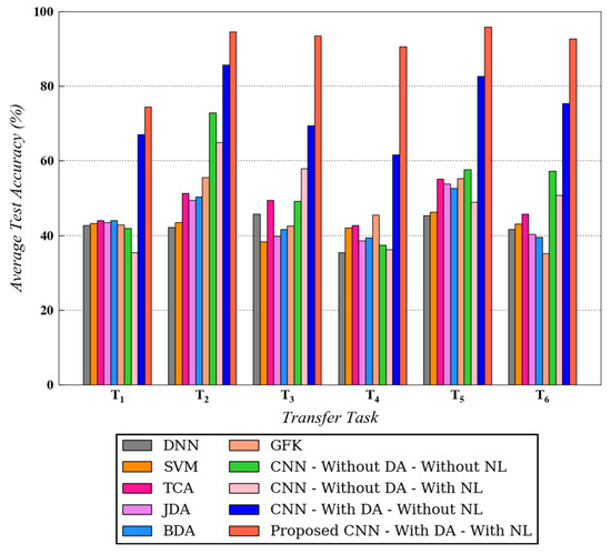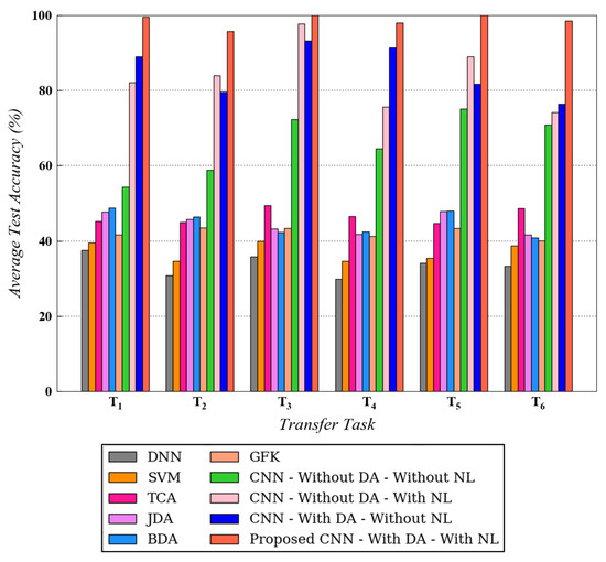 The performance analysis results also depict the difficulty in minimizing the domain discrepancy for different transfer scenarios. For instance, in Figure 10, it can be observed that the testing accuracy, using the proposed method, is considerably less for task as compared to tasks and in different scenarios. The possible explanation for this result can be that domain discrepancy is usually higher in tasks involving transfer across different speed conditions (task ). Since the tasks and involve the difference in load and force conditions, respectively, the transfer of learned knowledge across the domains is comparatively easier for these tasks. Hence, the model’s performance under various transfer scenarios is well evaluated in this section.