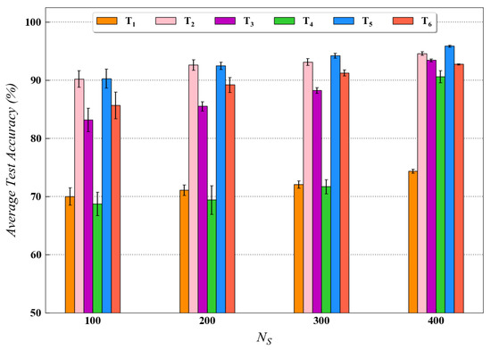 For quantitatively investigating the effect of training data size on the diagnostic performance of the proposed method, a performance analysis was also conducted in this study for both the datasets. The experimental results for this analysis are presented in Figure 9 and Figure 10 for the CWRU and Paderborn dataset, respectively. As observed in both figures, for each transfer task, the availability of a larger number of training data samples generally resulted in higher test accuracy. As stated in the literature, the performance of data-driven models usually improves when more data are available for training. The test results from this analysis are in accordance with the above statement; hence, they further validate our proposed approach.