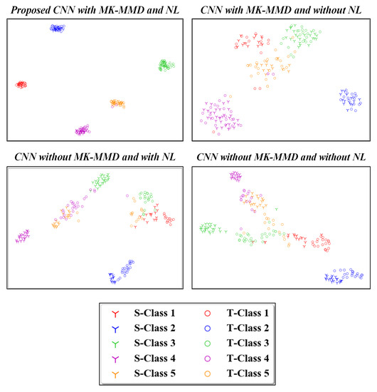 In this section, the high-level feature representations, captured by the fully connected layer in the network, are visualized for better interpretation and understanding of the cross-domain fault diagnosis results. The popular t-distributed stochastic neighbor embedding (t-SNE) technique was utilized for visualizing the high-level fault features. Compared to other multi-dimensional scaling methods or techniques such as PCA, t-SNE provides additional flexibility while capturing the local data characteristics, improved ability to handle outliers and better illustration of minor changes in the data structure [32,33].