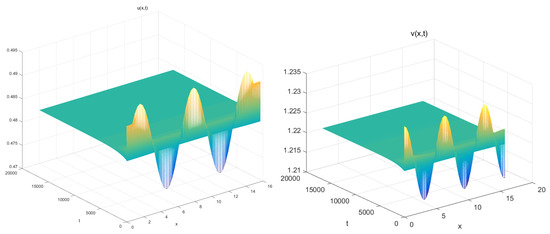 Figure 3. The numerical simulations of system (3) with τ = 1 and other parameters is given by (52). Left: component u. Right: component v.