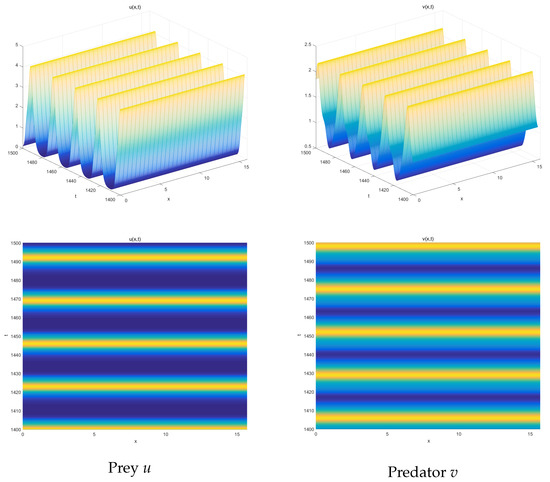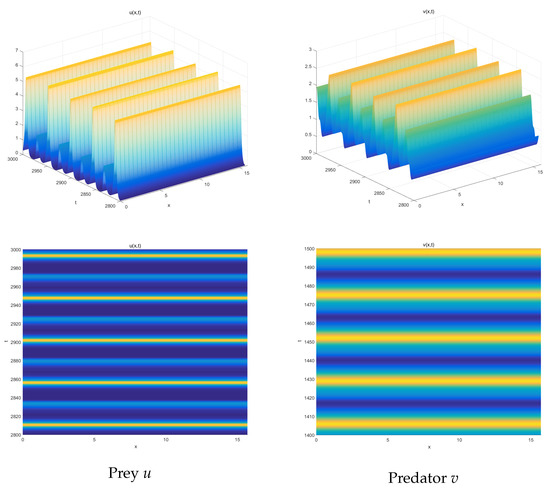 Hence, ( H ) holds. G = { 0 , 1 } . Let n = 0 , τ = τ 0 0 1.4414 and ω 0 0.3638 are obtained through calculation. From Theorem 1, P ( u 0 , v 0 ) is stable for τ [ 0 , τ ) . It is shown in Figure 3, here τ = 1 . In Figure 3, we can see that the predator and prey coexist, and as time goes on, they tend to the positive equilibrium ( u 0 , v 0 ) . P ( u 0 , v 0 ) is unstable and Hopf bifurcation occurs when τ = τ . From last section, we have ξ 1.0825 i , η 0.7964 i . Next,