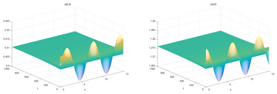 Figure 1. The numerical simulations of system (3) with τ = 0.5 and other parameters is given by (51). Left: component u. Right: component v.