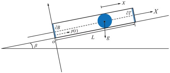 The VI-EH system can be modeled as a small ball of unitary mass rolling inside a forced cylindrical capsule that is inclined at a horizontal angle of , along with two DE membranes and for harvesting energy from ambient vibrations at the bottom and top of the capsule at distance L apart. The friction between the ball and the capsule is neglected, thus the motion of the ball is driven purely by impacts with one of the DE membranes and gravity. The elastic restitution coefficient for impacts between the ball and the DE membranes is , and the mass of the capsule is huge with respect to the mass of the ball, which means that the impacts do not affect the motion of the capsule. Assume that the capsule moves periodically according to a and 1-periodic function , i.e., , see Figure 1.