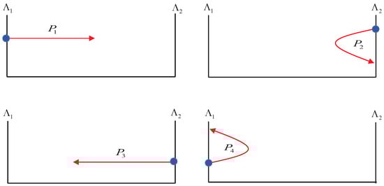 The symmetry of the system is mainly reflected in two aspects: on the one hand, it refers to the geometric symmetry of the system; on the other hand, it refers to the symmetry of the dynamical behavior of the system. The geometric symmetry is obvious. If the DE materials covered in both ends of the cylinder capsule are different, that is, the restitution coefficients of the collisions are different, then the dynamic behavior of the system is asymmetric (see [] for a similar analysis). If the restitution coefficients of the collisions are the same and is chosen as a class of specific functions that satisfies (n is odd integer), then the Poincaré map P of problem (3) has the property of symmetry, such that if Γ is an invariant curve of P, then is also an invariant curve of P (c.f. [,]).