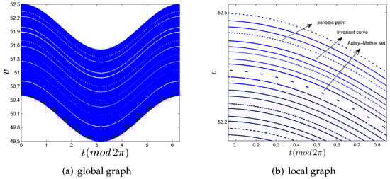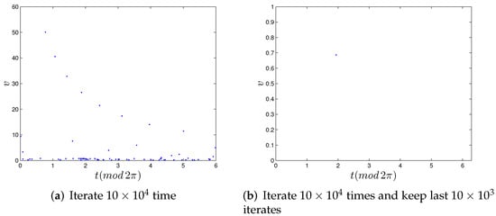 Choose , , m and v change from 50 m/s to 52 m/s. We find that the system exhibits regular dynamic behavior, mainly containing periodic points (Birkhoff type), invariant curves, and Aubry–Mather sets (the definition of Aubry–Mather sets can be found in []), see Figure 3. Moreover, the existence of invariant curves also ensures that the kinetic energy of the ball is always bounded. For the same parameter condition, i.e., only choosing m/s, e = 0.99, the dissipation introduced by the coefficient of restitution e destroys the regular dynamic behavior in the nondissipative case and generates a low-energy periodic point, see Figure 4.