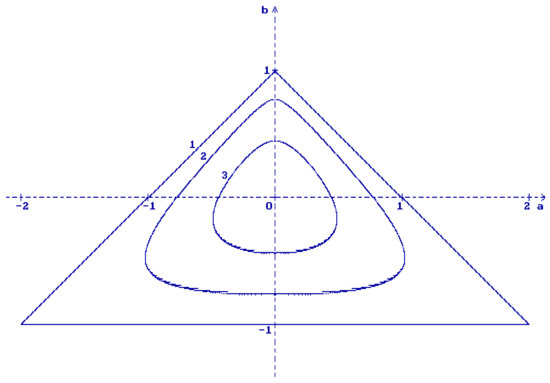Regions of stability for the Equation (25): (1) , (2) , (3) .