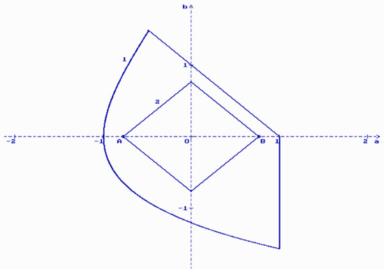 The solutions (30) define the region of asymptotic stability for the zero solution of the Equation (27) if . In Figure 2 the corresponding stability region (the bound 1) is shown for .
