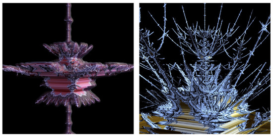 - Garg, A.; Agrawal, A.; Negi, A. Construction of 3D Mandelbrot Set and Julia Set. Int. J. Comput. Appl. 2014, 85, 32–36. [Google Scholar]