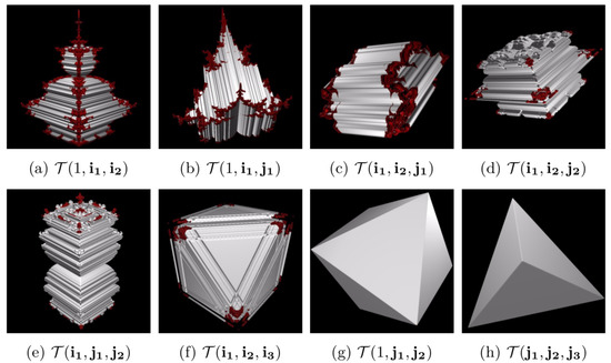 Among these are two principal 3D slices called the Tetrabrot (Figure 3a) and the Airbrot (Figure 3g), for which geometrical characterizations have been developed in [4,7], respectively. For the latter, doing so indirectly proved that the Airbrot is a regular octahedron, thus confirming the presence of a first Platonic solid within tricomplex dynamics.