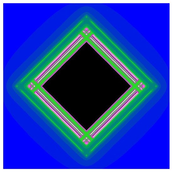 Figure 4 illustrates that the set A looks like a filled-in square with a fractal perimeter. Although this might seem intriguing, equivalence (7) provides a simple explanation for this phenomenon. Indeed, since , the visual appearance of the set A is entirely determined by the peculiar dynamics of the classical Mandelbrot set along the imaginary axis.