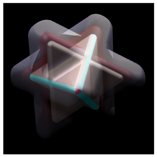 The above result reveals that the Turtlebrot can be expressed as the intersection of two other 3D slices. Moreover, in the right subspace, one of these slices is none other than a duplicate of the Mousebrot (Figure 3), while the second is obtained by applying a reflection along the plane to the first (the reference [35] contains another characterization of the same principal slice involving the Tetrabrot with all of the details). Interestingly, only one other principal 3D slice possesses the same property: the Hourglassbrot.