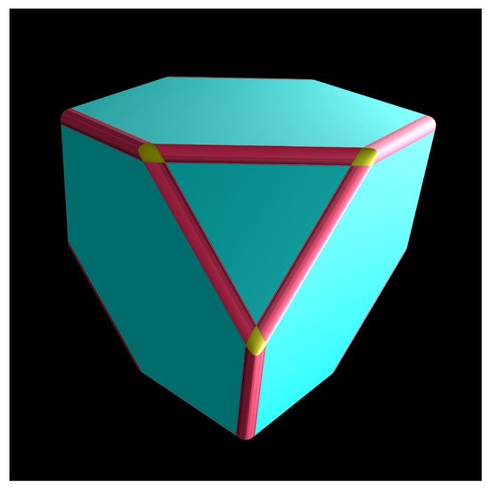 In subsequent works, it could be interesting to extend the classification of the principal slices of to the power . Doing so would probably expand the list of convex polyhedra found among the principal slices because when considering , the Firebrot strongly resembles a truncated tetrahedron, which is an Archimedean solid (Figure 7).