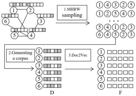 - Node Attribute Feature Learning: We employ the Metropolis–Hastings random walk (MHRW) algorithm [27] sampling, node sequence generation corpus, and Doc2Vec [28] model training to preprocess the attribute information, which is the attribute feature learning, named the MHRWAE algorithm. High-dimensional sparse attribute feature matrix learning can obtain low-dimensionality and better reflect the attribute feature learning matrix.