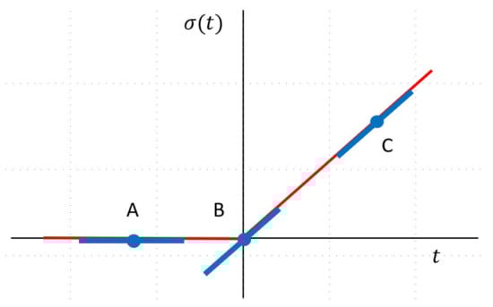 Based on Theorem 2, we may show that the proposed LLA algorithm shares the same convergence rate of the Fisher scoring algorithm. Thus, the convergence rate of the proposed LLA algorithm is quadratic. The Fisher scoring algorithm has been proposed for FNN back in 1990s [22]. Recently, researchers use Fisher information or Hessian matrix information by constructing natural gradient descent [15,16,23]. A natural question which arises here is why the Fisher scoring algorithm is not implemented directly. We have compared the LLA algorithm and the Fisher scoring algorithm via numerical simulation. Our numerical comparison implies that the LLA algorithm is more stable and converges faster than the Fisher scoring algorithm. This may be because is linear in , and (10) provides a better approximation than (15) for both and . In addition, the form of ReLU activation function implies that its first-order derivative is bounded, and its second-order derivative is 0 if it exists. The LLA algorithm takes advantages of it since the LLA in (4) is based on , the first-order Taylor expansion of . Figure 1 presents an illustration of the LLA of ReLU activation function at three different locations.