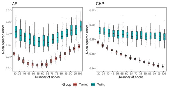 Figure 5 depicts the box-plots of AUCs for RN and MM data, respectively. For RN data set, the AUCs of training and testing data remain close to 1 across different number of nodes, and reach the maximum at approximately 30. As shown in Figure 5, when the number of nodes is small, LLA algorithm has a stable performance. As the number of nodes increases, it is likely to incur overfitting problem, especially for RN data set, leading to estimates with larger variance. For MM data, the AUCs of training data first increase and then keep constant when the number of nodes is chosen to be from 50 to 70. For the testing data, when the number of nodes varies from 15 to 35, the AUCs are close with each other. As the number of nodes increases, the AUCs for the testing data decrease and keep the same at approximately 0.85. When the number of nodes is too large, overfitting issue is likely to happen. As illustrated from these two data sets, when the number of nodes is set to be 30, the corresponding LLA classifier yields good performance in terms of prediction. Therefore, we set 30 as the default value in our numerical experiments for classification problems.