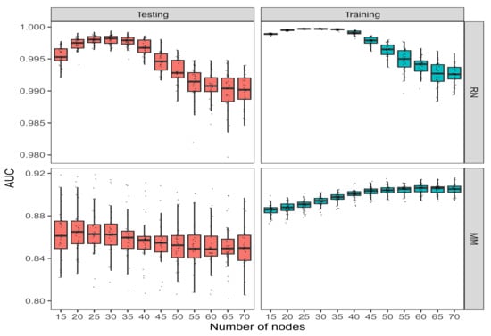 Box plots of 30 AUCs of LLA algorithm with nodes being set to for training and testing data. The top panel is the AUCs of RN data set, and the bottom panel is the AUCs of MM data set.