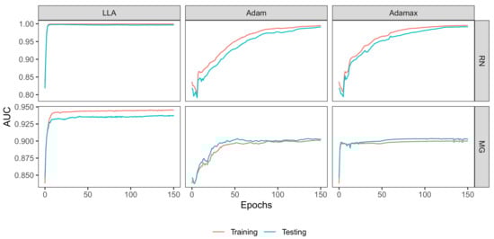 Figure 6 depicts the AUC scores of training and testing data versus the number of epochs for each algorithm. As seen from Figure 6, the AUC curves of the LLA algorithm increase and then become stable within 20 epochs for both RN and MG data sets. Both Adam and Adamax need many more epochs to have stable AUC values. For example, both Adam and Adamax need 150 epochs to have stable AUC values for RN data. This implies that the LLA converges faster than Adam and Adamax, consistent with our theoretical analysis. The LLA also performs better than the Adam and Adamax in terms of AUC score. This can be clearly seen from the AUC plots for the MG data set.