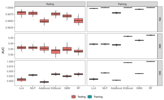 We next compare the performance of the LLA classifier with other procedures with default settings. The number of nodes in the LLA for RN, MM and MG data sets are 30. The number of max epochs is set to be 100. Table 3 depicts the values of 100 times of the sample mean and standard deviations of the 30 AUC scores for the testing data (testing AUC for short) as well as those for the training data (training AUC for short). Table 3 implies that the LLA performs the best for RN and MM data sets in terms of AUC scores, followed by MLP. Figure 7 compares the AUC scores of different methods more explicitly. As shown in Figure 7, all procedures have small standard deviation for the testing data. However, for the training data, RF has a large standard deviation for the RN data while XGBoost, GBM, and Adaboost have more fluctuations for the MM data. The LLA has small standard deviations for all data sets, illustrating that the LLA retains stability. The differences between the testing AUCs and training AUCs are small for the LLA classifier, which shows that it is less likely for the LLA classifier to be over-fitting. For MG data, the RF performs the best, followed by XGBoost. This motivates us to examine the data further by considering multi-layer network, which will be discussed in Section 3.4 in details.