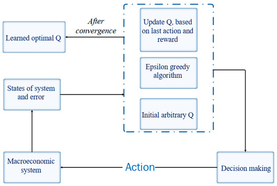 In the current study, we propose a reinforcement learning-based method for optimal control of the macroeconomic system. Traditionally, designing optimal control for nonlinear systems is challenging [56]. When the model of a system is known, using the algebraic Riccati equation, we can design the optimal control law for linear systems. However, when designing an optimal control law for nonlinear systems, the Hamilton–Jacobi–Bellman equation must be solved [57].