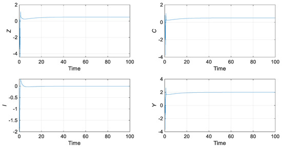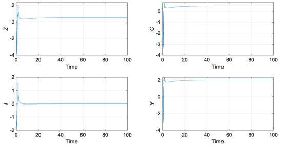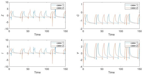 The time history of the macroeconomic system is shown in Figure 3. It illustrates the time history of the system with different initial conditions. It is noteworthy that since we did not examine the absolute values of the system’s variables, and only their rates of change have been examined, they can be negative and positive. For this simulation, and . Additionally, for case 1 and case 2, the initial conditions are considered to be [−2, 0, 1, −1] and [−8, 1, 1, 6], respectively. As is depicted in Figure 3, the behavior of the system depends on the initial condition [66].