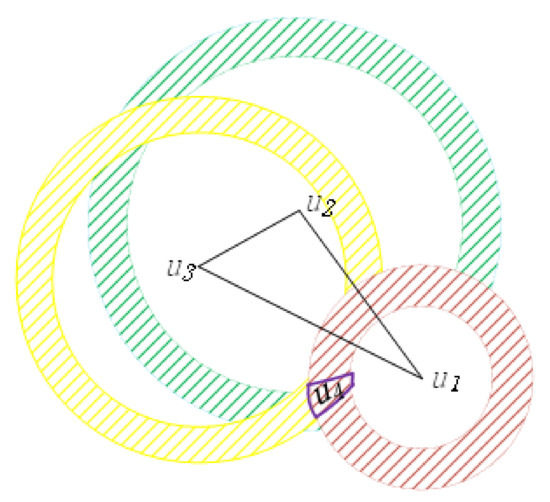The idea in Reference [11] is as follows: The rating matrix of the user–item (range 1–5 of the score) is first flipped (subtract each score from the maximum score of 5), the obtained matrix is called the distance matrix. For example, in the rating matrix, assuming that the user’s rating for the item is 5, which is changed to 0 by flipping operation (5-5). That is to say, the distance between u and i is 0. If u’s rating for i is 1, after flipping the operation (5-1), it becomes 4; that is to say, the distance between u and i is 4. The logical meaning of this approach is that if a user scores an item highly, it means that they have some similarity in the attributes of interest, so the distance is small; on the contrary, if a user scores an item extremely low, it means that he does not like the item, then the user and the item are not similar in the attributes of interest, so the distance is far away. Now consider the positions of in distance. Because Sim > Sim > Sim, is the closest to in Euclidean distance, followed by distance between and , and the biggest is the distance between and . We use the Euclidean distance between two vectors to represent similarity; the smaller the Euclidean distance, the greater the similarity, as shown in Figure 2. Then, because Sim > Sim > Sim, that is, is nearest to , followed by the distance to , and the farthest distance to , we use a red ring (minimum radius) to express the possible positions of satisfying the minimum distance to , a yellow ring (centered in radius) to indicate the possible position of , which satisfies the distance from , and a green ring (largest radius) to indicate the possible position of , which satisfies the maximum distance from . The coincidence region of the three rings is the positions of , which satisfies the relationship of Sim > Sim > Sim. This shows that the Euclidean distance is more reasonable than the angle in describing relationships between vectors in low-dimensional space.