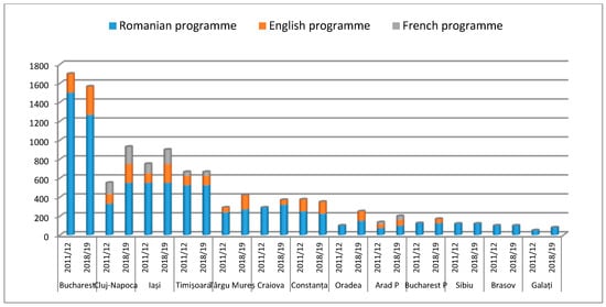 According to the map of Europe regarding the number of physicians available per hundred thousand inhabitants (Figure 1), it can be seen that the countries registering most physicians are Norway, Lithuania, and Austria, followed by Bulgaria, Germany, and Switzerland. The places with the fewest number of physicians per 100,000 inhabitants are Poland, Romania, Serbia, UK, and Montenegro. These countries register the largest shortage of physicians, but developed countries, such as the UK, cover this shortage by attracting physicians from other countries. Instead, for less developed or developing countries, it is almost impossible to cover this deficit, because the conditions offered to physicians are not attractive. In the case of Romania, a cause for physicians’ shortage is represented by physician’s migration, and this should be balanced, either by attracting physicians from other countries or by increasing the number of graduate physicians in the country. Attracting physicians from other countries is difficult to achieve because, in Romania, wages and working conditions are not attractive for physicians from other countries. If we analyze the number of new entries to medical schools for the period 2011–2012 and 2018–2019, there is not an increase or a very small increase if any. For Bucharest, there is even a decrease. An increase in students for English and French programs was observed; thus, we can consider these students are either foreign students who came to Romania to continue their studies, or Romanian students who consider migrating after graduation (Figure 2).