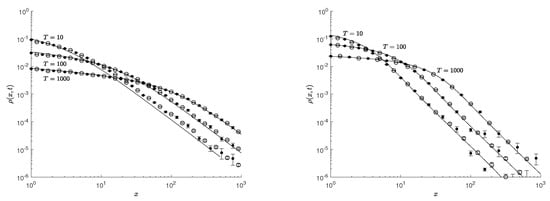 The solution to Equation (46) for the case of exponential distribution of rest times (26) and (on the left) and (on the right). The solutions are given for three values of time T, as indicated in the figures. The points are local estimate results (52), the circles are histogram estimation results (50), the solid curve is the solution (48) with a generalized diffusion coefficient .