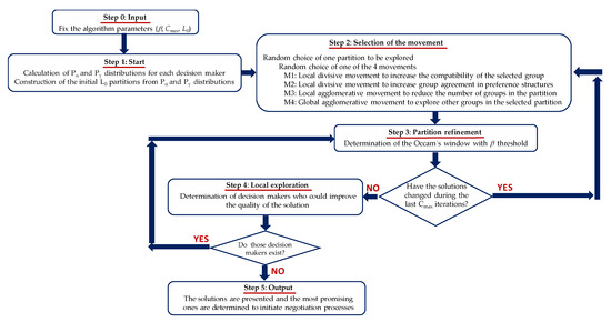 Decision-makers who improve the quality of the solution are identified and relocated to other groups. In this step, for each partition in , we analyze if a decision-maker change the group, the value of L(Y|) is improved. Specifically, the elements of are randomly ordered. Then, for each G ∈ we carry out the following steps a) to e):
