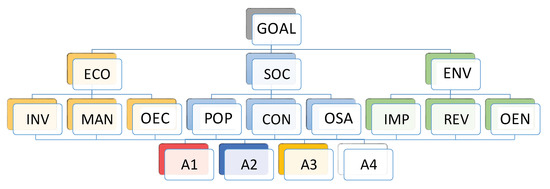 The AHP methodology consists of three stages: (i) Modelling: construction of a hierarchical model that collects the relevant aspects of the problem (goal, criteria, sub-criteria for different levels, attributes, and alternatives) at the different levels; (ii) Valuation: incorporation of the preferences of the actors by eliciting, using the Saaty’s fundamental scale, the judgments of the PCMs for each node of the hierarchy; (iii) Prioritization and Synthesis: calculation of the local priorities, using a prioritization procedure, and the global priorities, by means of the hierarchical composition principle, for each of the elements (nodes) of the hierarchy, and the total priorities of the considered alternatives following an aggregation synthesis.