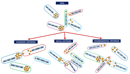 We can therefore observe that most of the groups relegate the environmental criteria to third place, with two majority groups of 9 decision-makers clearly separated in the Goal graph: G1 on the one hand, and G4 ∪ G5 on the other hand, that place the economic or social criteria as the most important ones, respectively. In addition, the graph of the Goal highlights that decision-makers who support economic criterion as the most preferred are more homogeneous in their opinions about the rankings of compared criteria than those who support social criterion, and these differ in their opinion about the importance of the economic and environmental criteria (see Figure 3).